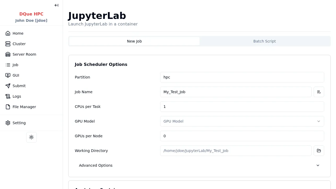 Section titled “3단계: 제출”- 제출 을 클릭합니다. 할당된 컴퓨트 노드에서 JupyterLab을 시작하는 배치 작업이 생성됩니다.