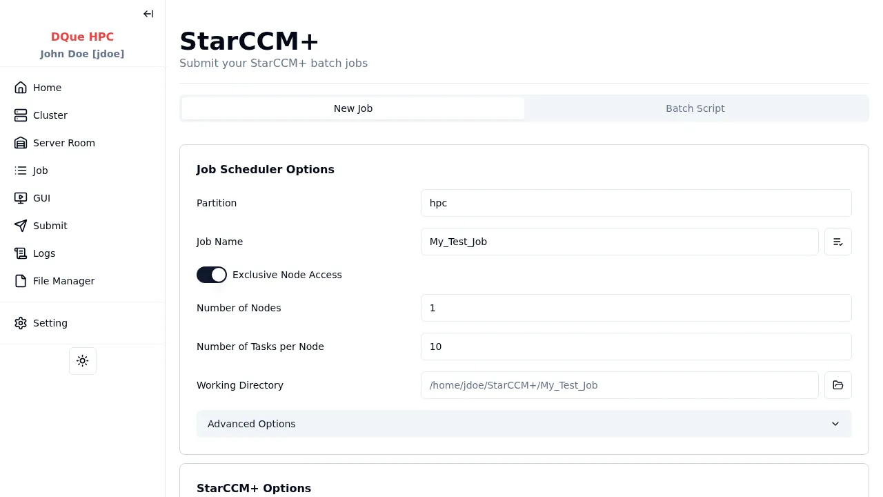 Section titled “4단계: 제출”제출 을 클릭하여 SLURM 스케줄러에 배치 작업을 보냅니다. StarCCM+ 솔버가 할당된 노드에서 헤드리스로 실행됩니다.