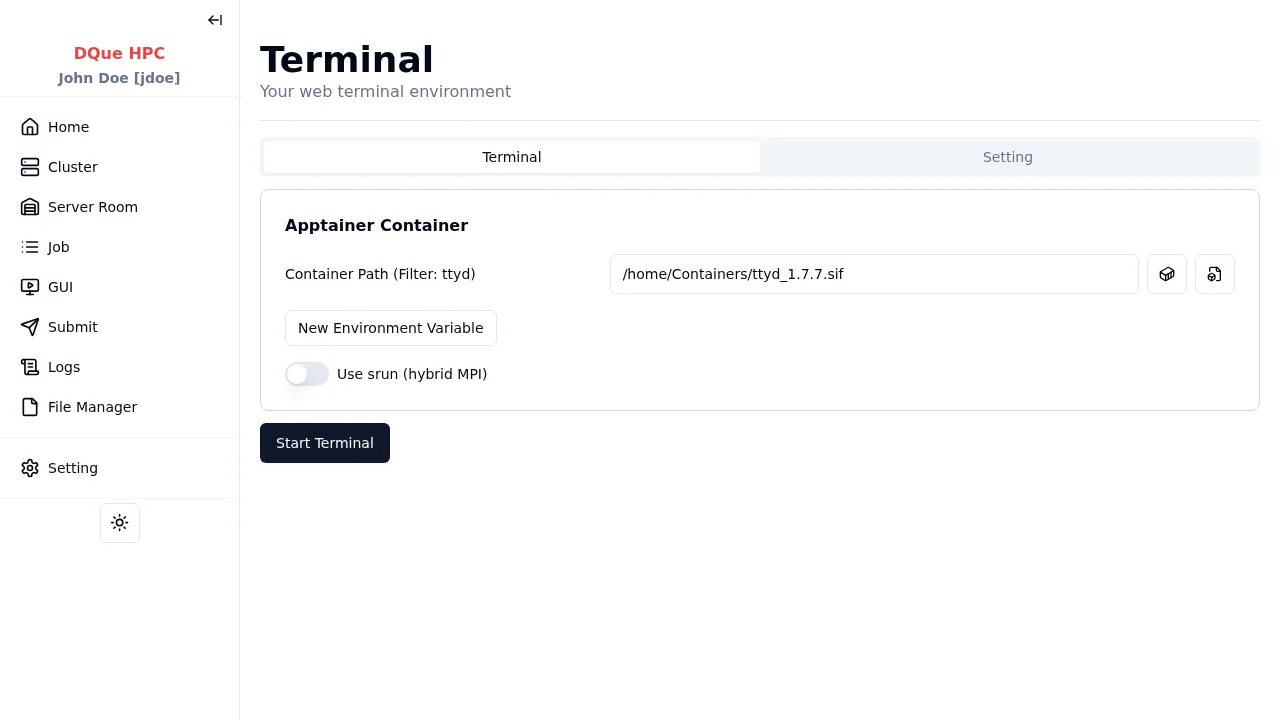 Section titled “1단계: Apptainer 컨테이너 구성”- 컨테이너 경로 — 터미널 환경용 Apptainer 컨테이너 경로 (필수). 드롭다운에서 선택하거나 사용자 지정 경로를 찾아보기.